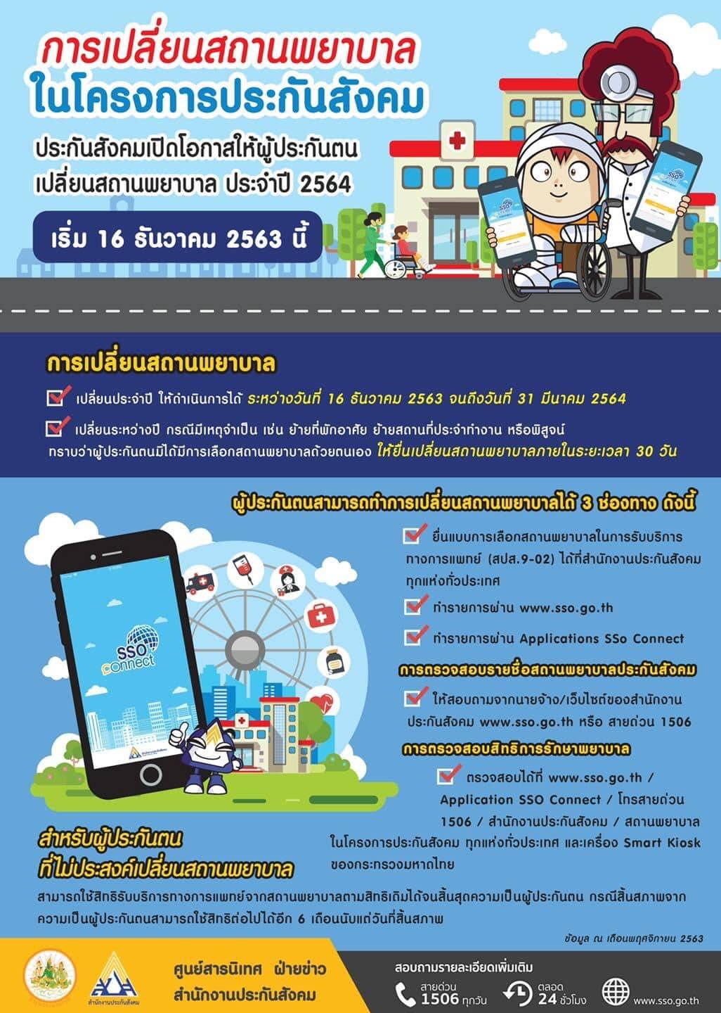 สำหรับการเปลี่ยนสถานพยาบาลในโครงการประกันสังคม ทางประกันสังคมได้เปิดโอกาสให้ผู้ประกันตนเปลี่ยนสถานพยาบาล ประจำปี 2564 ได้ในช่วงเวลาดังนี้